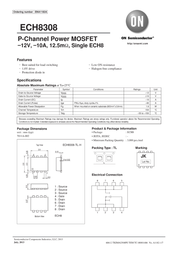 Power MOSFET -12V -10A 12.5 mOhm Single P-Channel ECH8