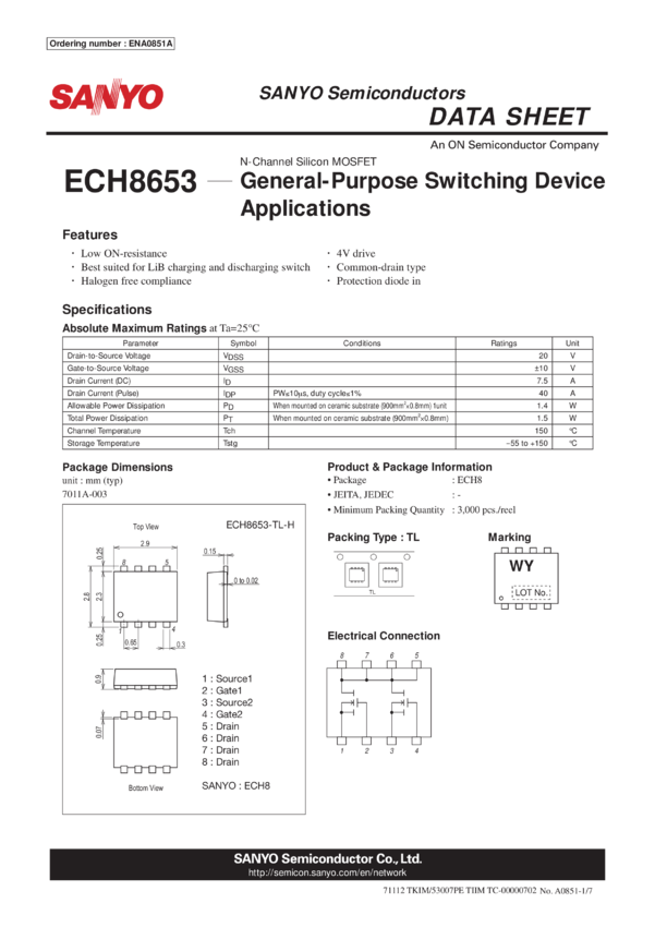Power MOSFET 20V 7.5A 20 mOhm Dual N-Channel ECH8