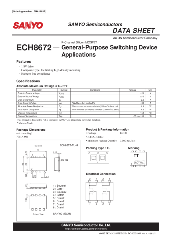 Power MOSFET -20V -3.5A 85 mOhm Dual P-Channel ECH8