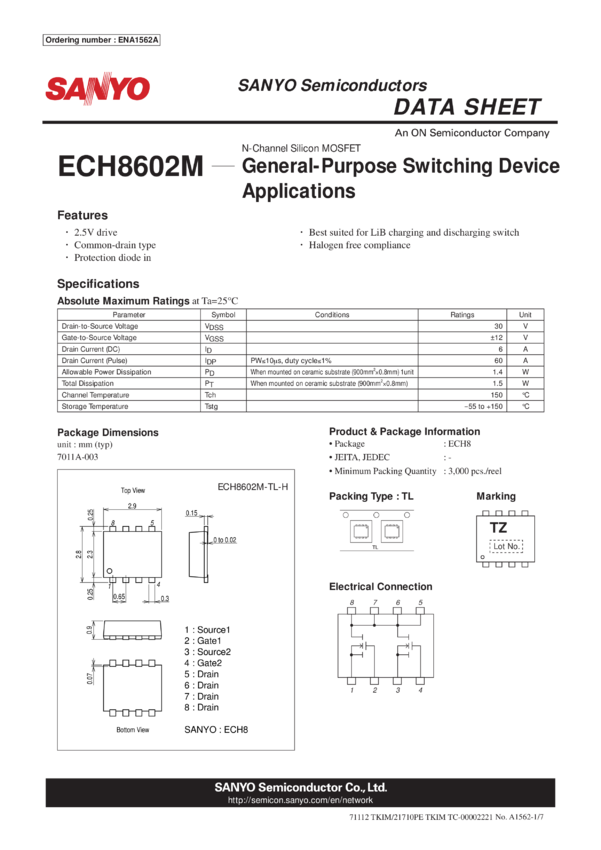 Power MOSFET 30V 6A 30 mOhm Dual N-Channel ECH8