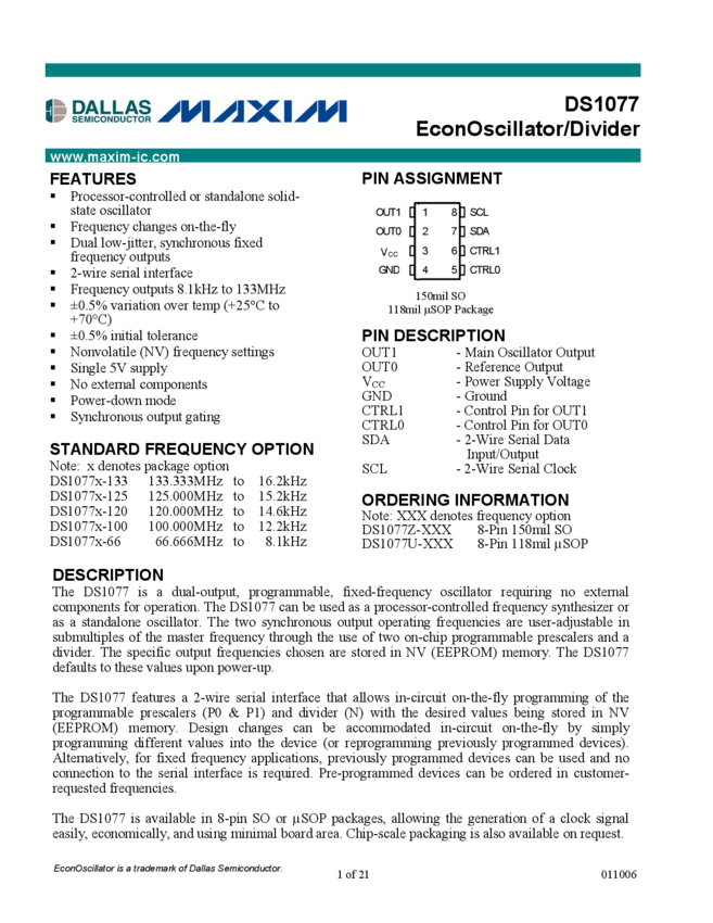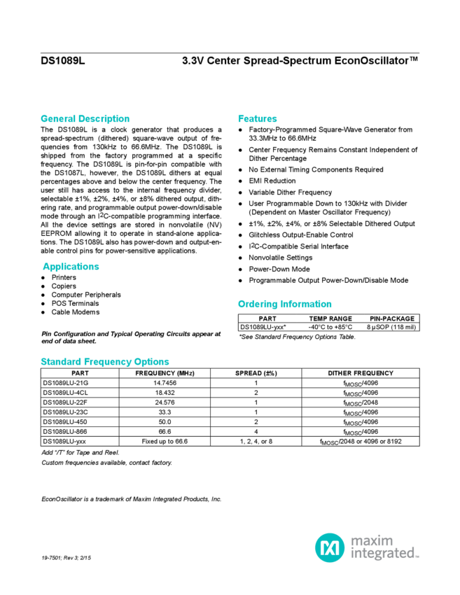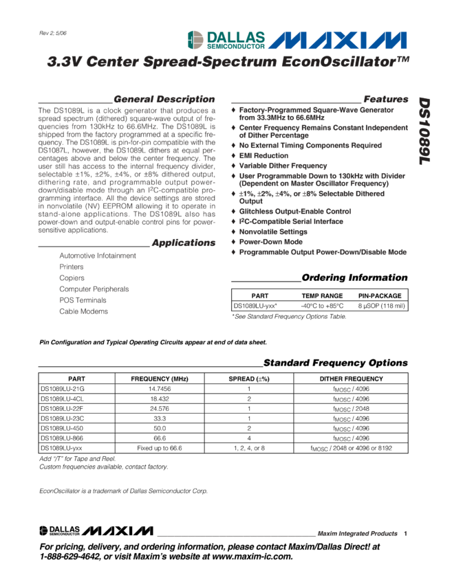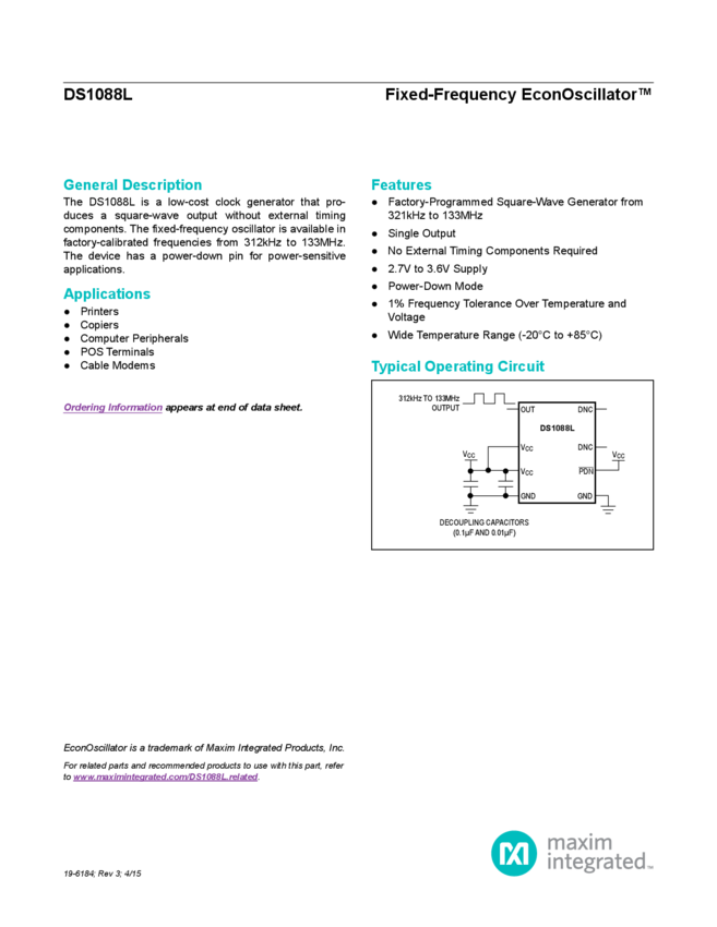 DS1088, DS1088L Fixed-Frequency EconOscillator™