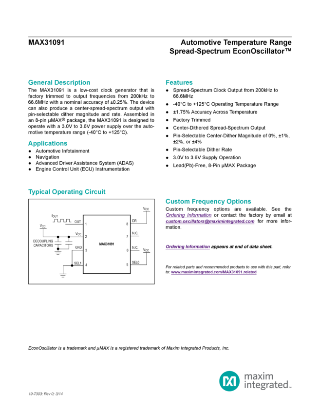 MAX31091 Automotive Temperature Range Spread-Spectrum EconOscillator