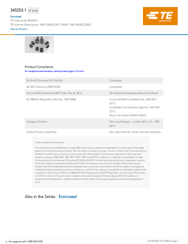 TE Connectivity 345253-1 TE AMP Econoseal - Connectors, 1 szt.