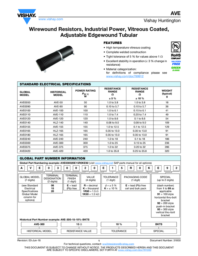 Wirewound Resistors, Industrial Power, Vitreous Coated, Fixed Edgewound Tubular