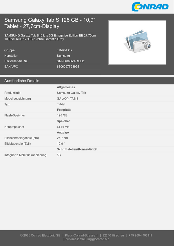 Samsung Galaxy Tab S10 Lite Enterprise Edition 5G, WiFi 128 GB szary Tablet 27.7 cm (10.9 cal) EEK F (A - G) 2 GHz Samsu