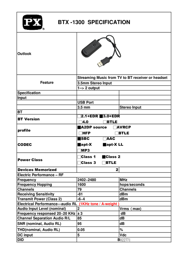 Adapter, nadajnik Bluetooth audio Renkforce BTX-1300, Wersja Bluetooth 3.0 +EDR, SBC, technologia AptX, 10 m
