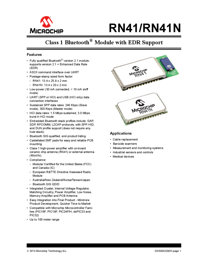 RN41/RN41N Class 1 Bluetooth Module with EDR Support Data Sheet
