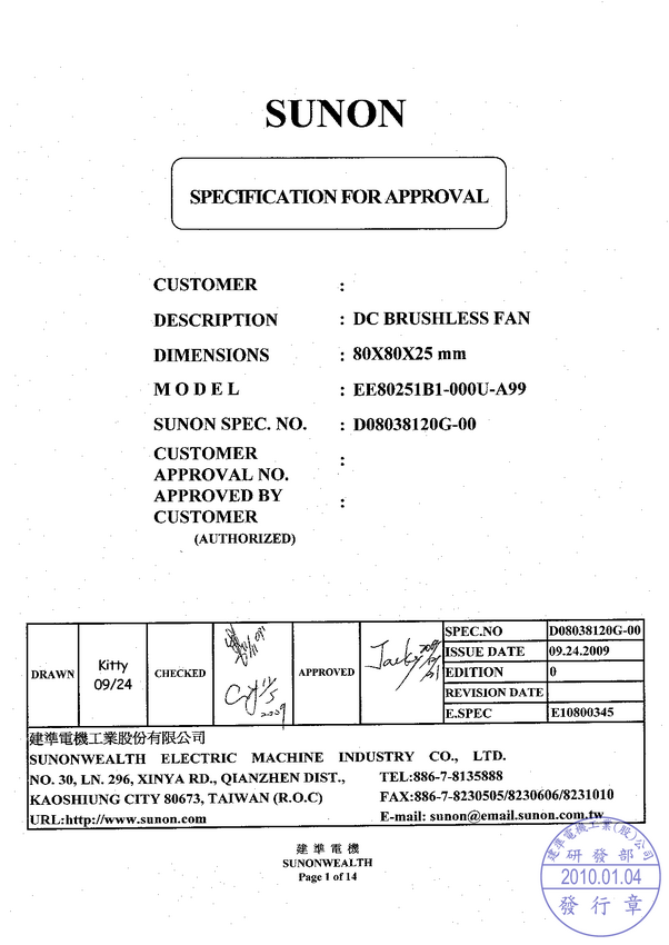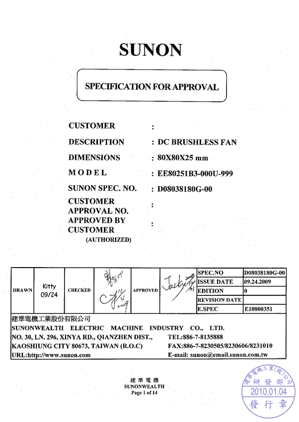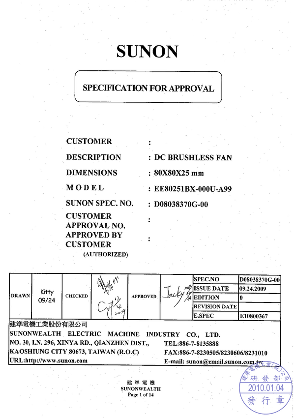 Wentylator; DC; osiowy; 12VDC; 80x80x25mm; 69,5m3/h; 33dBA; kulkowe; 2pin; EF80251B1-000U-A99 = EE80251B1-1000U-A99; SUNON; 12232; RoHS