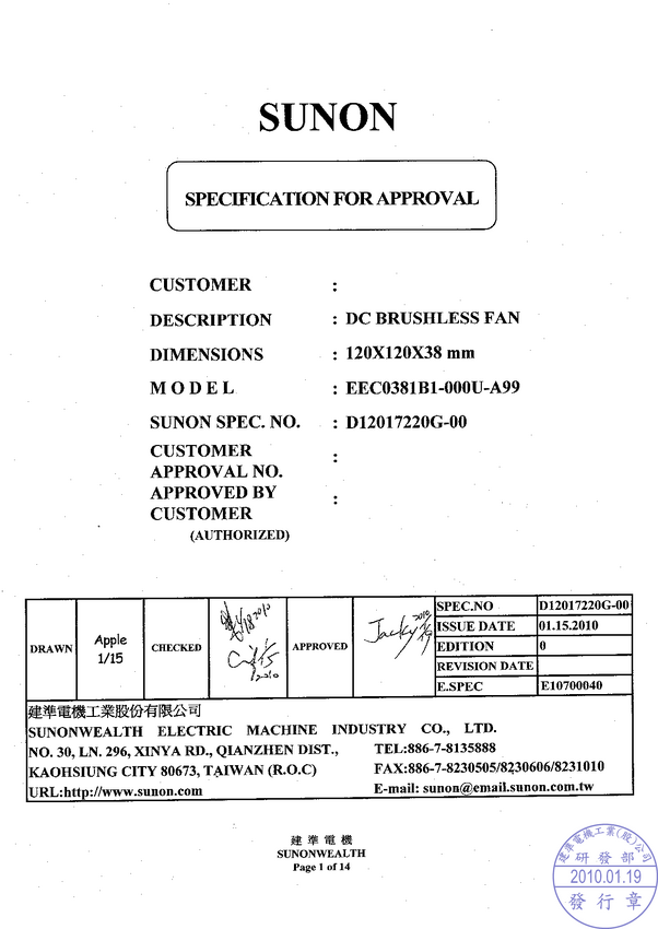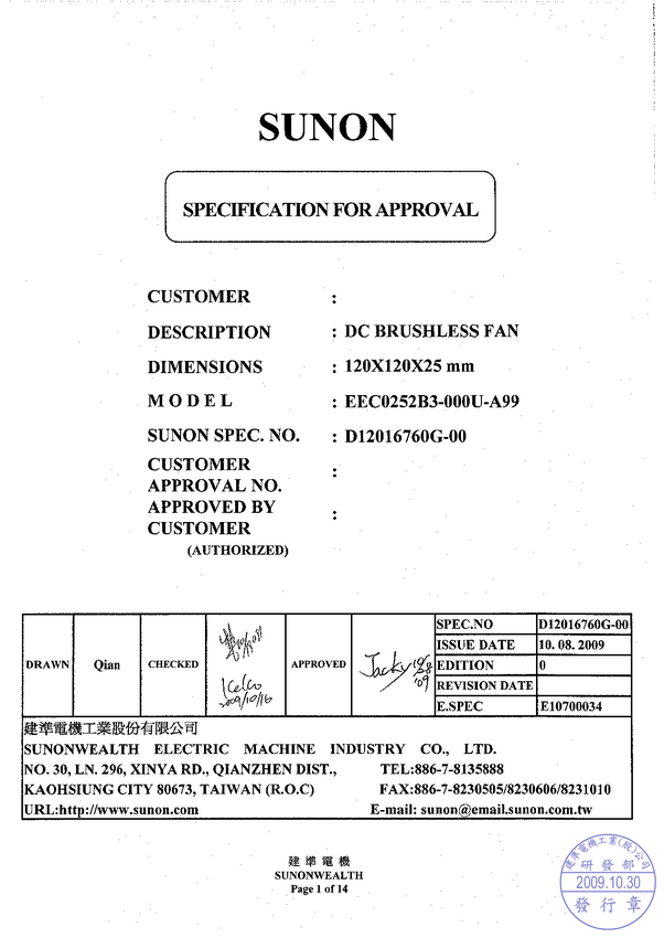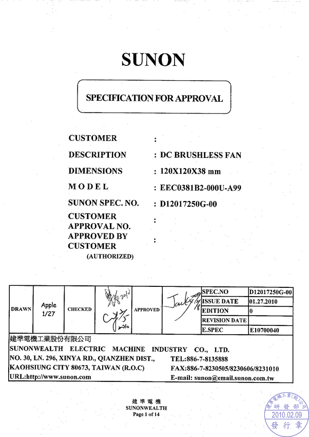 Wentylator 120x120x38 mm; łożysko kulkowe 24V 234 m3/h; 48 dbA; I=0,4A; P=9,2W; 3100 RPM łożysko kulkowe; P=9,2 W; I=0, 383A RPM 2600 Prąd 383 mA / Max 440 mA Rated Power Consumption 9,2 W / Max10..57 W Operating voltage 10-27,6 Vv DC Starting Voltage 10 V D -10+70 stopni 2600 RPM Life 70.000 ours at 40 deg Polarity protection Automatic restart Kabeli 2 długoś 300 mm 24 AWG czarny i czerwony 48 dB