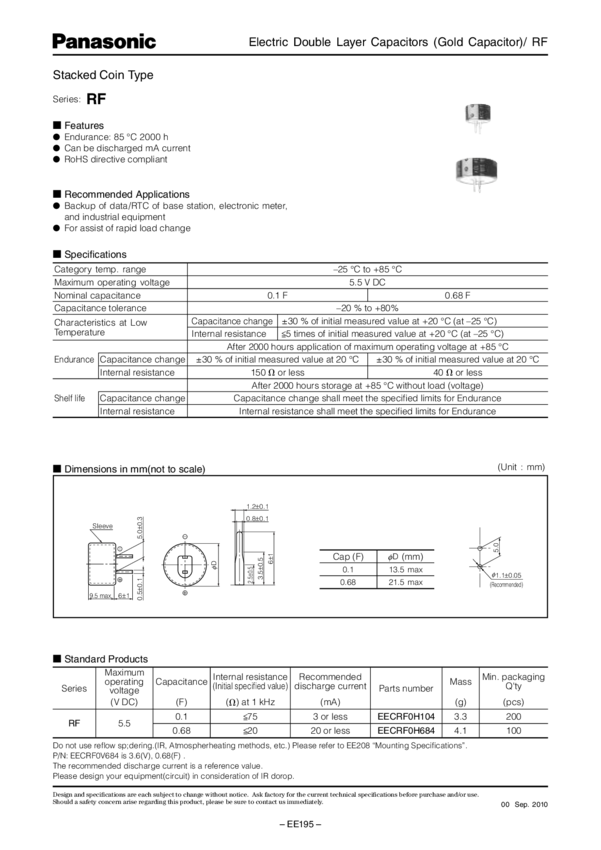 Cap 0.68F 3.6V -20% to 80% 2000 hr (21.5 X 9.5mm) Radial Stacked Coin 5mm 85°C Tray