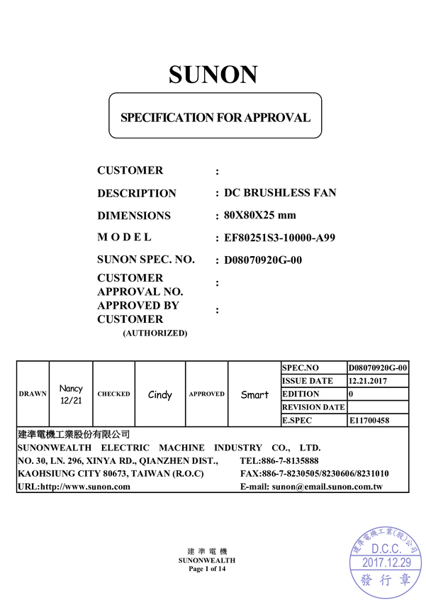 Wentylator osiowy Sunon EF80251B3-1000U-A99, 12 V/DC, 56.05 m³/h, (D x S x W) 25 x 80 x 80 mm