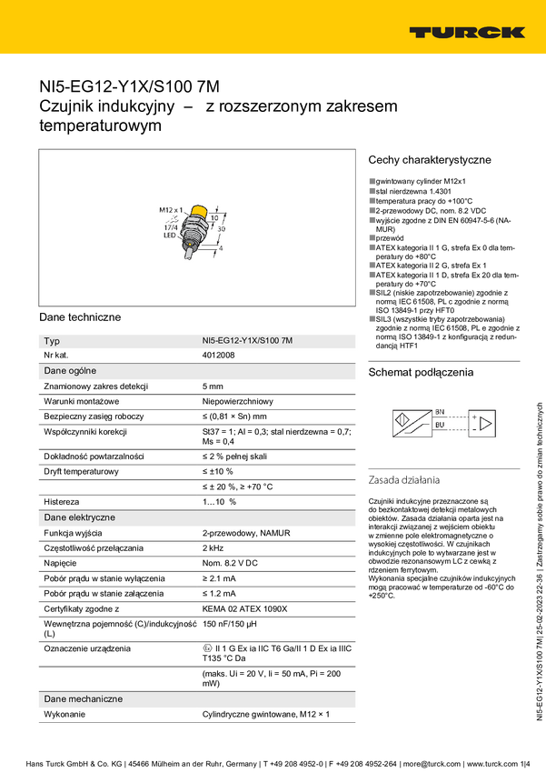 Turck Czujnik indukcyjny nie podtynkowy NAMUR NI5-EG12-Y1X/S100 7M