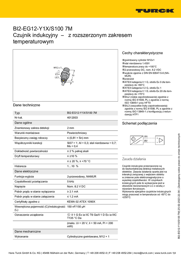 Turck Czujnik indukcyjny podtynkowy NAMUR BI2-EG12-Y1X/S100 7M