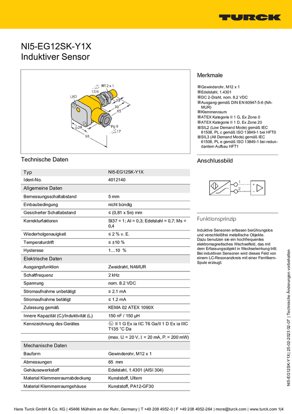 Turck Czujnik indukcyjny nie podtynkowy NAMUR NI5-EG12SK-Y1X