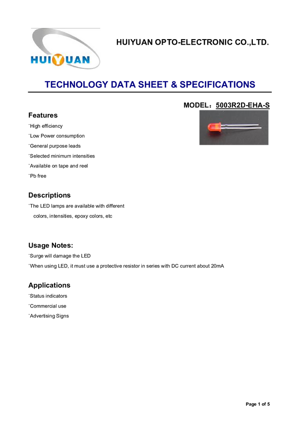 HuiYuan 5003R2D-EHA-S Dioda LED THT czerwony okrągły 5 mm 75 mcd 50 ° 20 mA