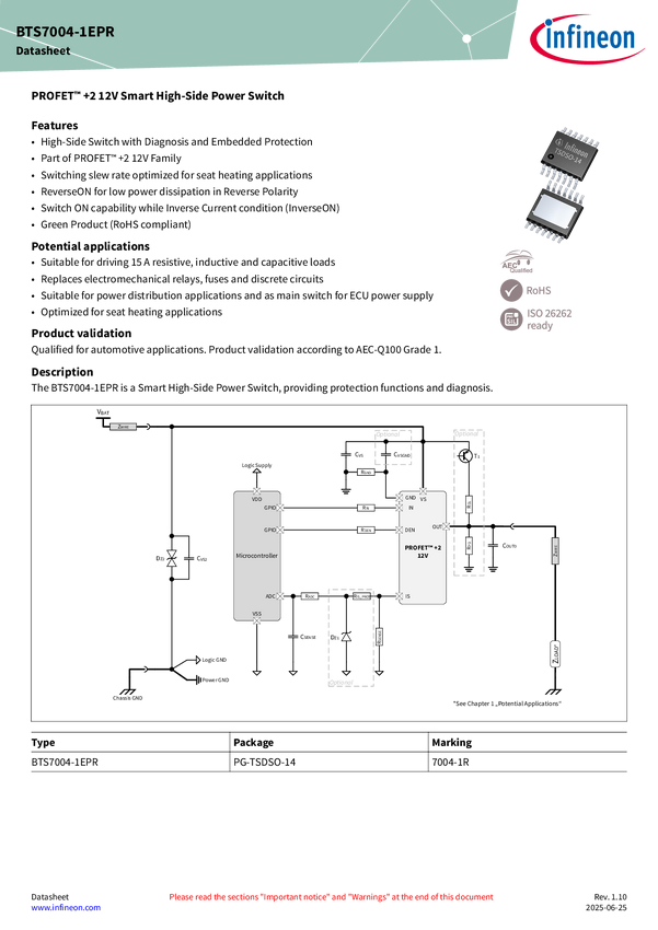 12 V | 4.4 mΩ | 15 A | 1 channel smart high-side power switch | analog current sense | seat heating application The BTS7004-1EPR is a Smart High-Side Power Switch, providing protection functions and diagnosis. The product supports power distribution and seat ehating application.