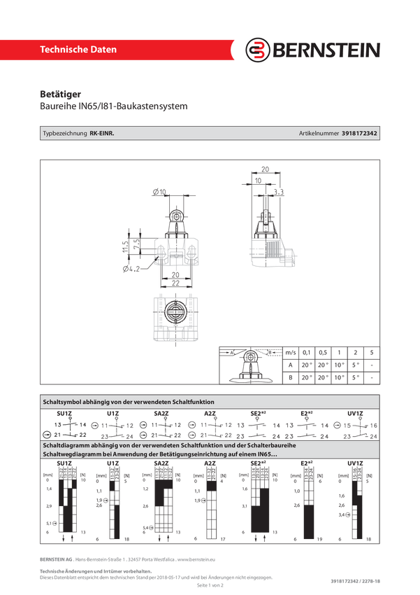 Bernstein 3918172342 RK-EINR. Aktuator dźwignia z rolką IP66/IP67 1 szt.