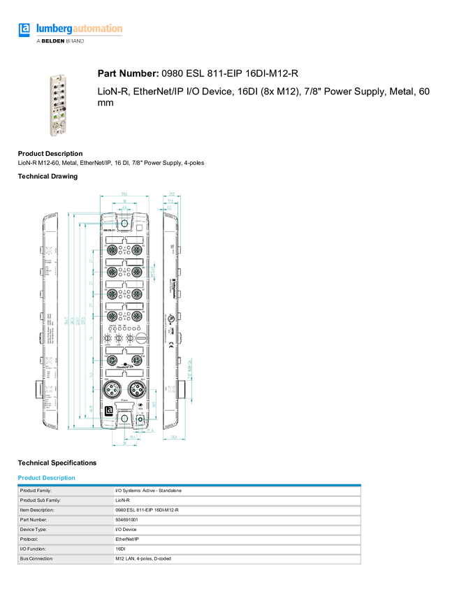 Rozdzielacz czujnik / element wykonawczy, aktywny Lumberg Automation 0980 ESL 811-EIP 16DI-M12-R 934 691-001 1 szt.