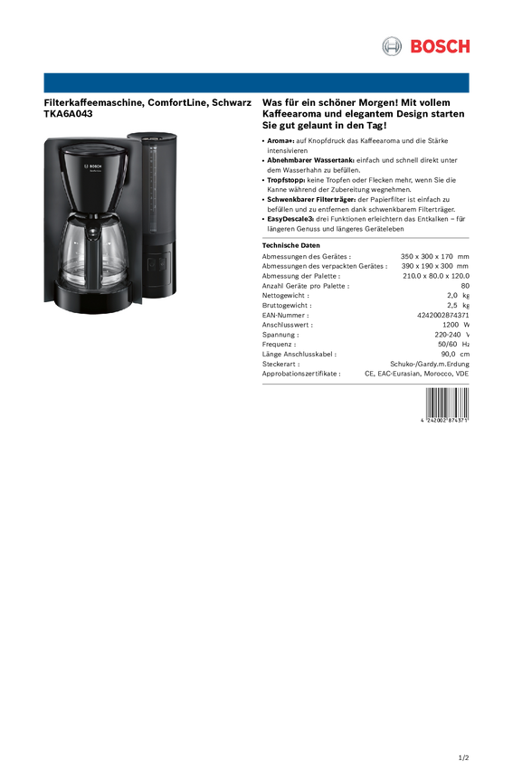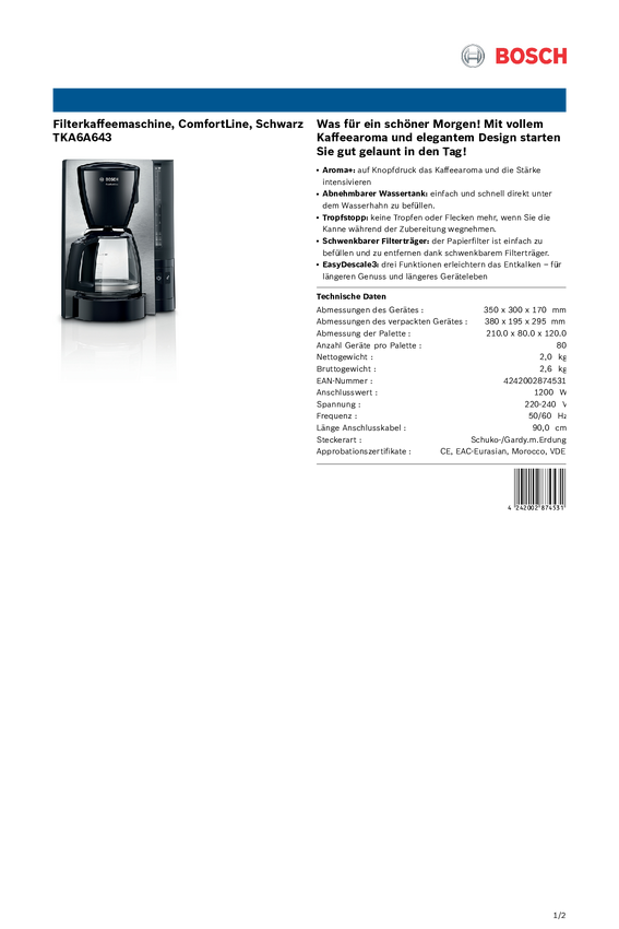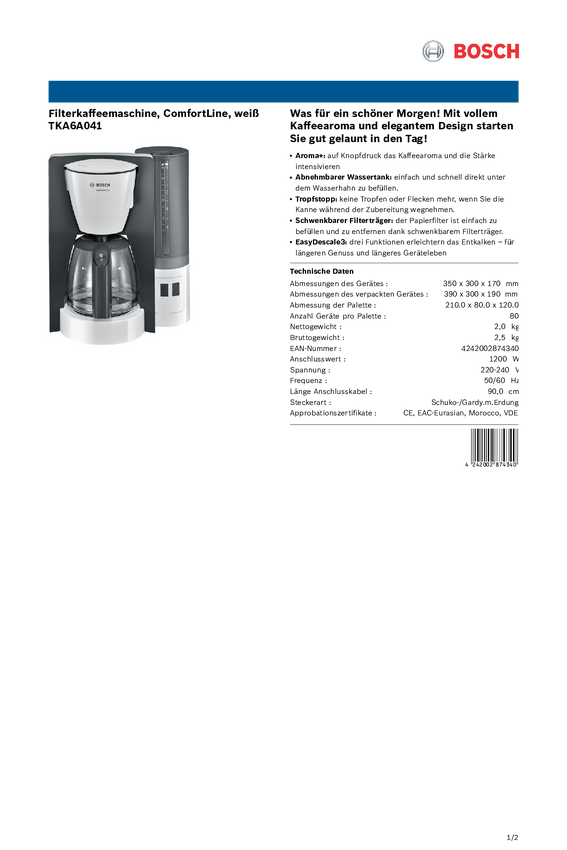 Ekspres do kawy Bosch Haushalt TKA6A041 TKA6A041 1200 W