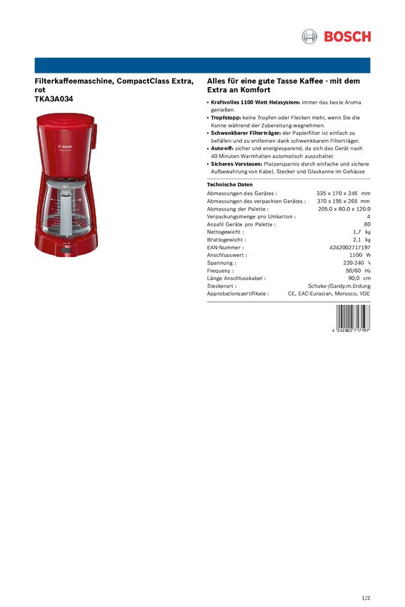 Ekspres do kawy Bosch Haushalt TKA3A034 TKA3A034 1100 W