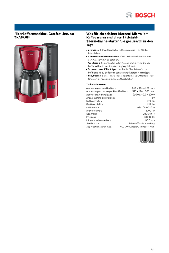 Ekspres do kawy Bosch Haushalt TKA6A684 TKA6A684 1200 W