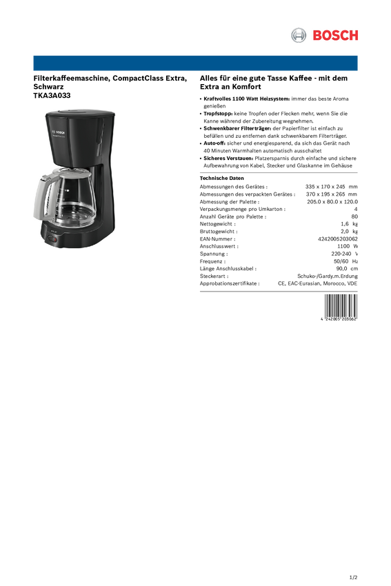 Ekspres do kawy Bosch Haushalt TKA3A033 TKA3A033 1100 W