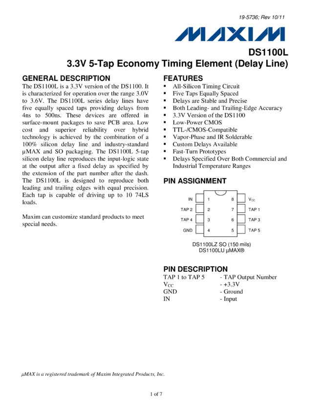 DS1100L 3-Volt 5-Tap Economy Timing Element (Delay Line)