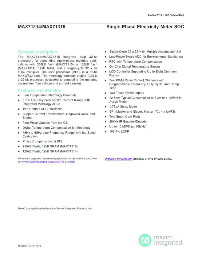 MAX71314, MAX71315 Single-Phase Electricity Meter SOC