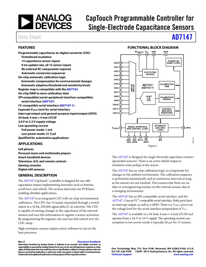 AD7147: CapTouch™ Programmable Controller for Single-Electrode Capacitance Sensors