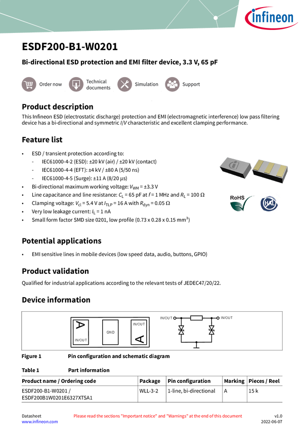 Bi-directional ESD protection and EMI filter device, 3.3 V, 65 pF This Infineon ESD (electrostatic discharge) protection and EMI (electromagnetic interference) low pass filtering device has a bi-directional and symmetric I/V characteristic and excellent clamping performance.