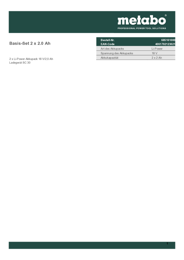 Akumulator do elektronarzędzi Metabo Basic-Set 2 x 2.0 Ah 685161000, Li-Ion, 2.0 Ah, 18 V