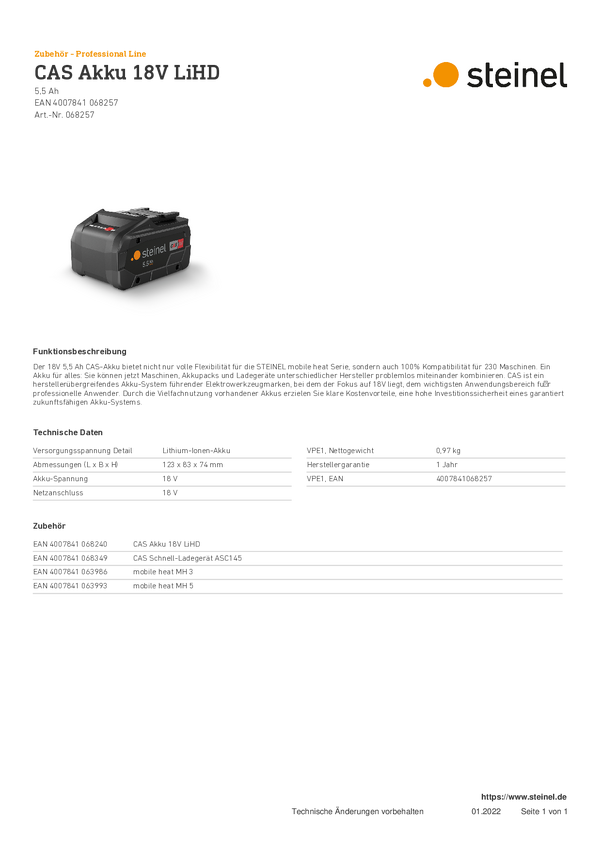 Akumulator do elektronarzędzi Steinel CAS LI-HD 5.5 068257, Li-Ion, 5.5 Ah, 18 V