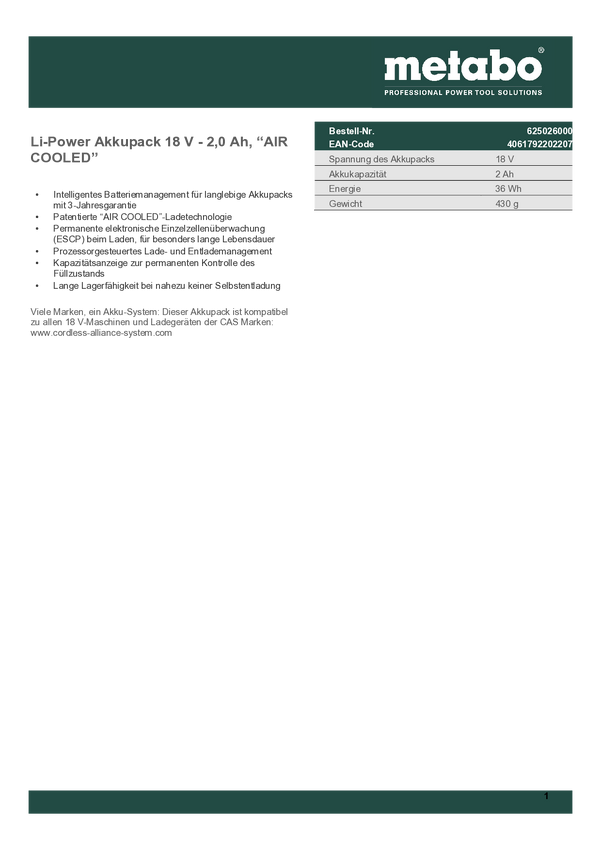Akumulator do elektronarzędzi Metabo 625026000, Li-Ion, 2.0 Ah, 18 V