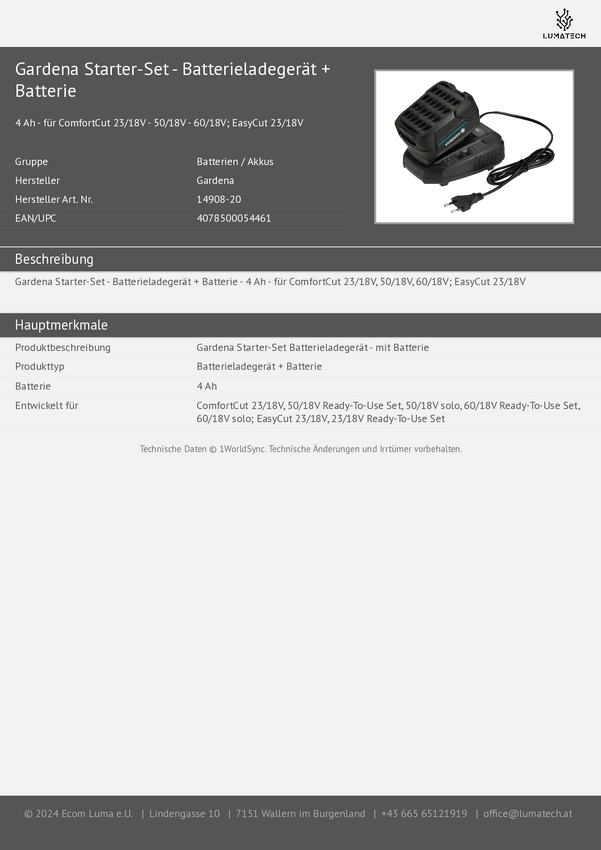 Ładowarka i akumulator do elektronarzędzi GARDENA P4A PBA 18V/72 4,0 Ah + AL 1830 CV 14908-20, Li-Ion, 4.0 Ah, 18 V