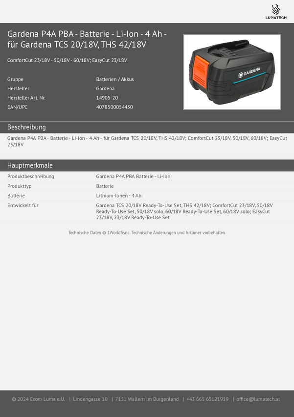 Akumulator do elektronarzędzi GARDENA P4A PBA 18V/72 4,0 Ah 14905-20, Li-Ion, 4.0 Ah, 18 V