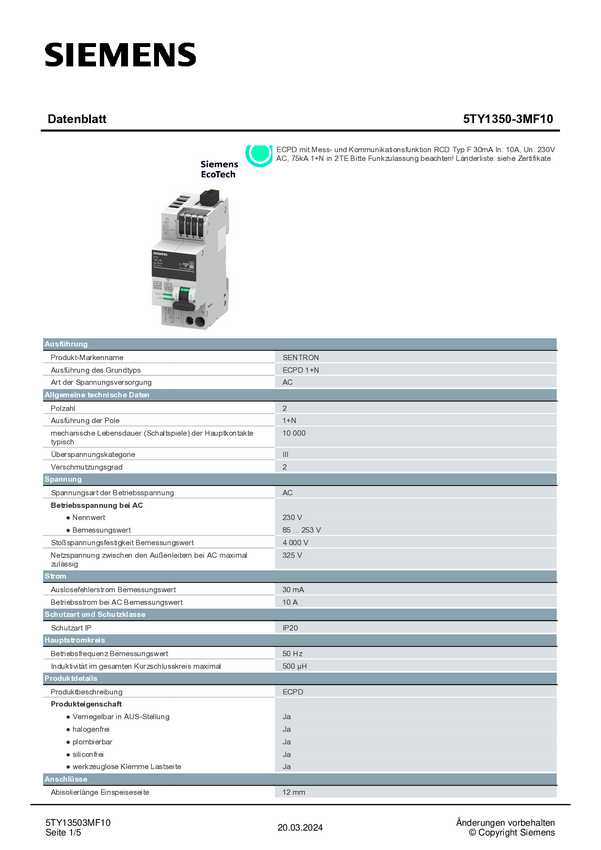 Siemens 5TY13503MF10 Elektroniczne ochronne urządzenie przełączające 1-fazowy F 2 styki 0.03 A 230 V