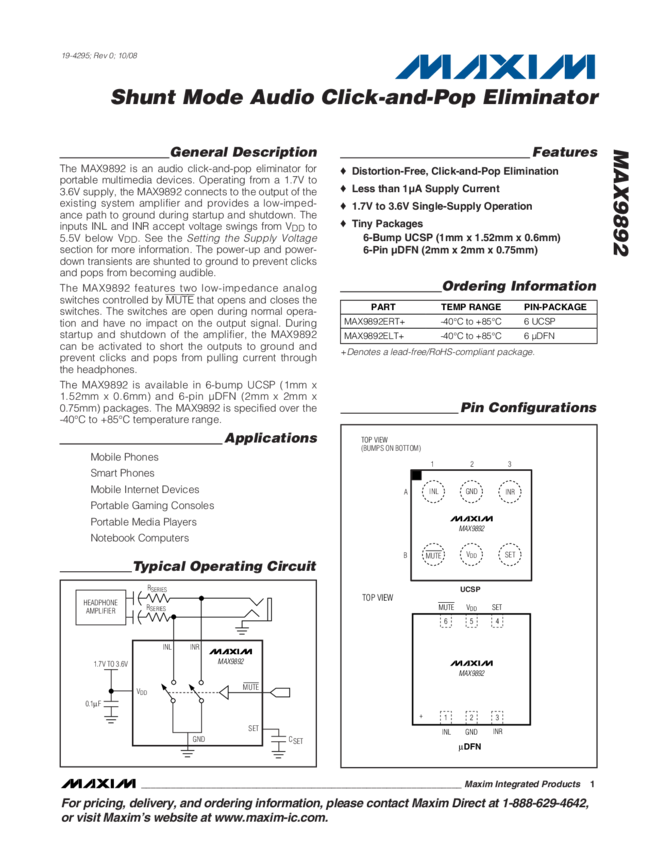 MAX9892 Shunt Mode Audio Click-and-Pop Eliminator