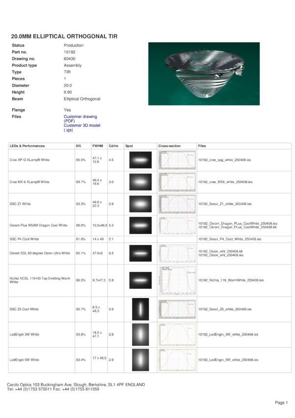 Soczewka Carclo 10192, eliptyczna 90&deg, do diod Cree serii XP-G, MX-6, XM-L, XP-C, śr:20, wys:9,9mm, FWHM(XP-G):47,1&deg x 12,6° FWHM(XP-C):6&deg x 49,1&deg