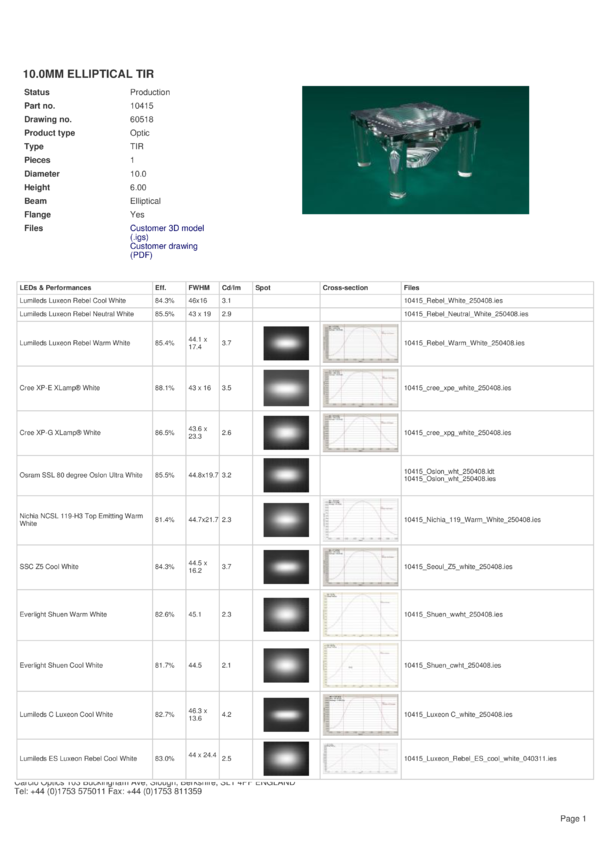 Soczewka Carclo 10415, eliptyczna, do diod Cree serii XP, XT-E, śr:10mm, wys:6mm, FWHM(XP-E):43&deg x 16° FWHM(XP-G):43,6&deg x 23,3° FWHM(XP-C):46,2&deg x 12,5&deg