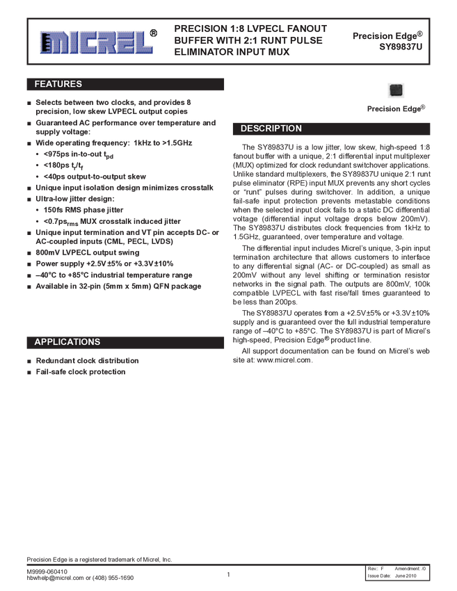 Precision 1:8 LVPECL Fanout Buffer with 2:1 Runt Pulse Eliminator Input Mux