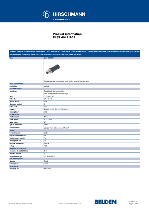 Złączka wtykowa Hirschmann ELST 4012 PG9 933 162-100-100 100 szt.