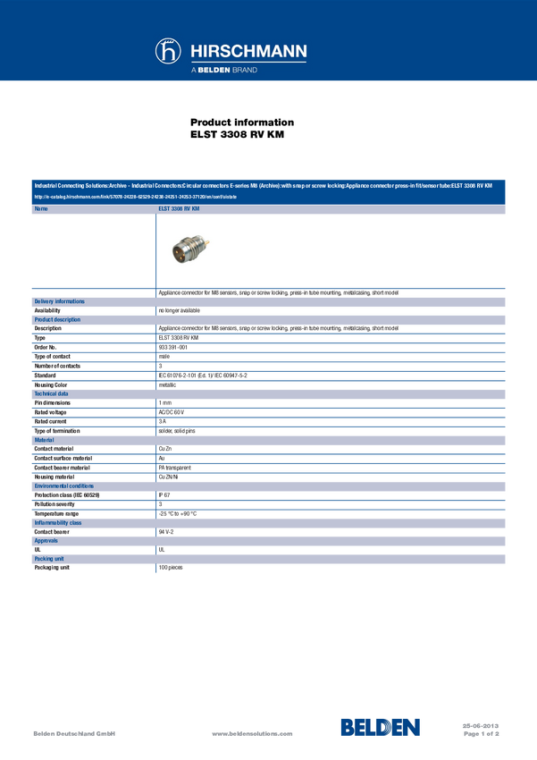 Złącze Hirschmann ELST 3308 RV KM 933 391-001-100 100 szt.