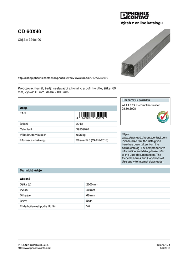 Kanał na wiązki Phoenix Contact CD 60X40 3240190 Kanał kablowy, elstyczny (D x S x W) 2000 x 60 x 40 mm 20 szt.