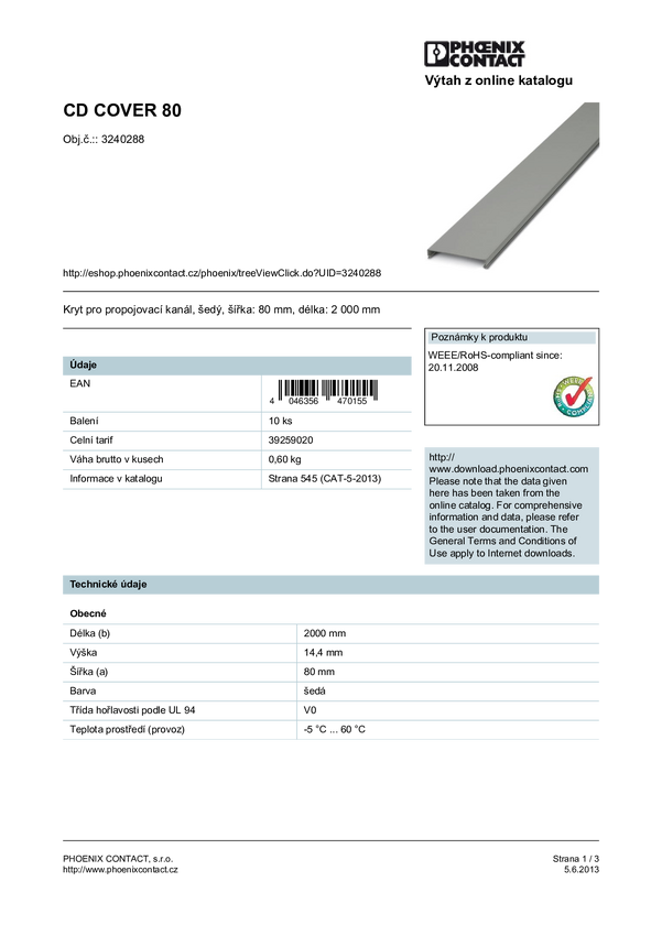 Kanał na wiązki Phoenix Contact CD COVER 80 3240288 Kanał kablowy, elstyczny (D x S x W) 2000 x 80 x 14.40 mm 10 szt.