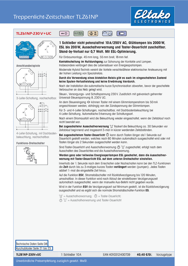 Wyłącznik czasowy Eltaco TLZ61NP-230V+UC, 1 - 12 min., 10 A, 230 V