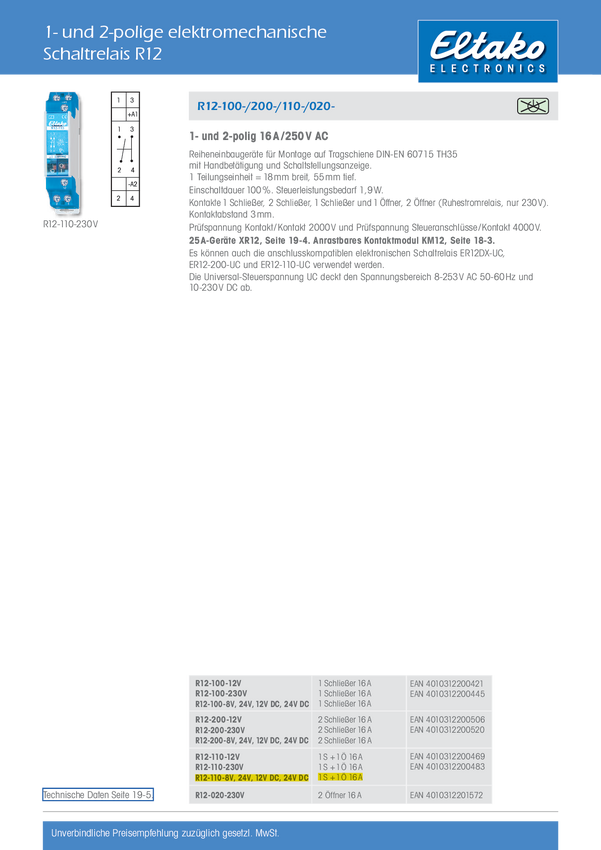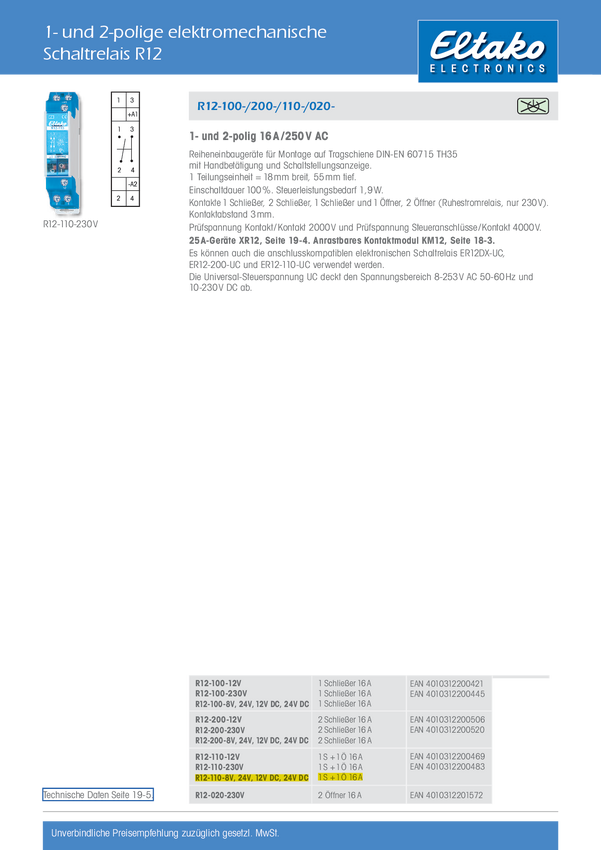 Eltako 21110020 Przełącznik przepięciowy S12-110-24V, 2300 W, 10 A