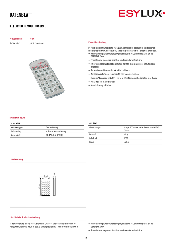Pilot zdalnego sterowania do czujnika ruchu ESYLUX EM10025501 srebrny