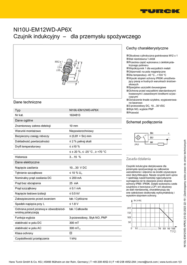 Turck Czujnik indukcyjny nie podtynkowy PNP, Zamykający NI10U-EM12WD-AP6X