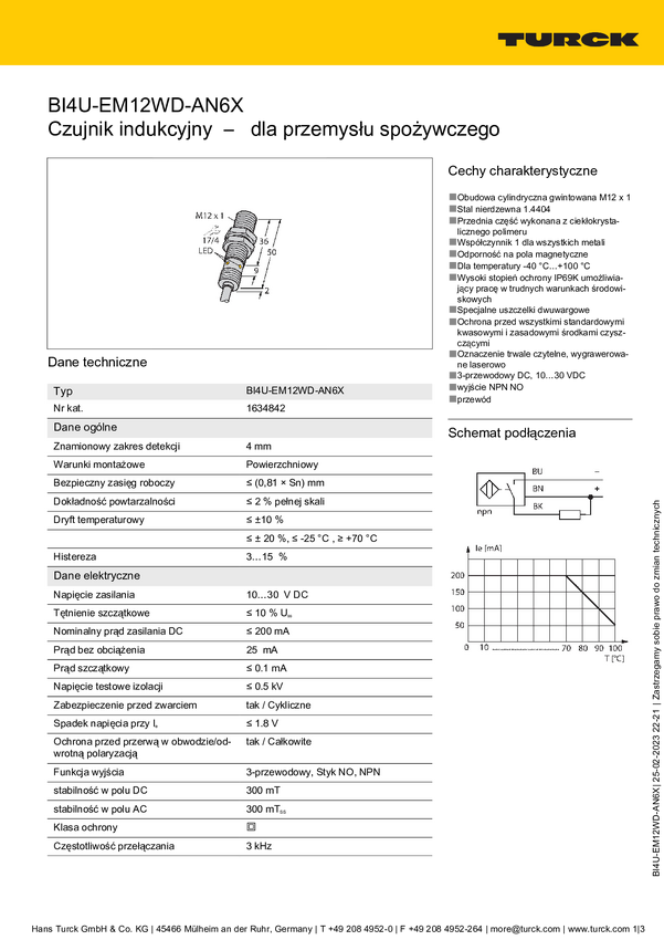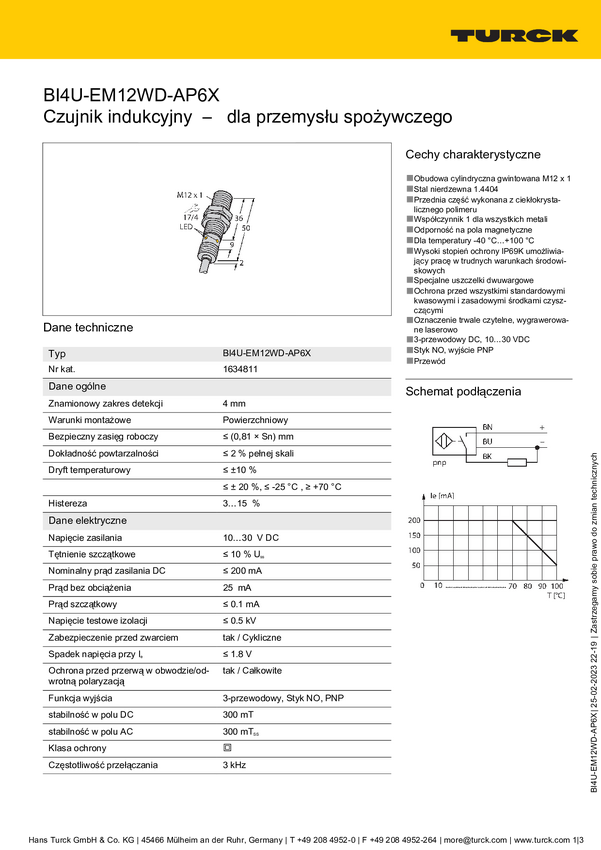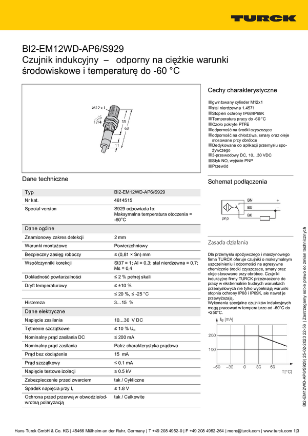 Czujnik indukcyjny Turck BI2-EM12WD-AP6/S929, 10 - 30 V, 1 szt.