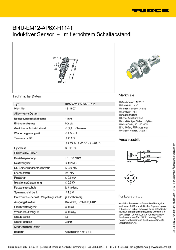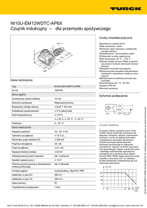 Turck Czujnik indukcyjny nie podtynkowy PNP, Zamykający NI4-EM12D-AP6/S120